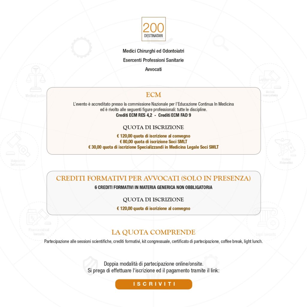 La quota di partecipazione è si 120,00 euro; 80,00 per i soci SMLT e 30,00 per gli specializzandi in Medicina Legale Soci SLMT.